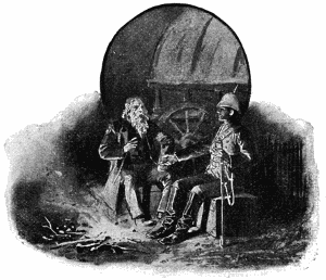 Pieter Maritz drängte sein Pferd zwischen dem Vieh hindurch in den Kreis der Wagen und sah an dem größten der Feuer eine zahlreiche Versammlung von Buern, Männer und Frauen, darunter auch seine eigene Familie lautlos versammelt. Sie hörten der Abendandacht zu, welche ein stattlicher Mann mit unbedecktem, weißem Haupte und langem, weißem Bart hielt. Pieter Maritz kannte diesen Mann nicht, hörte aber an seiner Aussprache des Holländischen, daß es ein Deutscher sein müsse. Als Kanzel diente dem[S. 13] Prediger der Vorderkasten einer der großen Wagen, so daß er über der schweigenden und andächtigen Gemeinde stand. Sein ehrwürdiges Antlitz war vom Feuerschein hell beleuchtet. Er sprach über die Verwüstung, die der letzte Kampf angerichtet habe, und tröstete seine Zuhörer über ihre Verluste. Zuletzt stimmte er mit starker Stimme und dem Ausdruck unerschütterlicher Zuversicht eine Hymne an und sang: