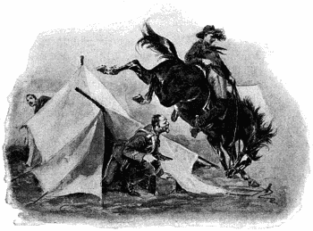Als er den letzten Ausgang der Höhle erreicht hatte und aus der Spalte hervorkam, welche ein schmales Eingangsthor in dem moosüberkleideten Felsen bildete, sah er, daß die Sonne schon tief am Horizonte stand und daß der Einbruch der Nacht in etwa einer Stunde zu erwarten war. Es galt also, die Zeit zu benutzen, um noch vor der Dunkelheit ein tüchtiges Stück Weges zurückzulegen. Er lenkte sein Pferd nach rechts, um denselben Pfad durch das[S. 9] Dickicht zurückzureiten, welcher ihn hierher geführt hatte, aber das Tier widersetzte sich und zeigte eine beharrliche Neigung, nach links zu gehen. Weder Zurufe noch Zügeldruck wirkten, es stemmte zuerst seine Vorderfüße fest in den Boden und fing dann an, auf den Hinterbeinen in die Höhe zu steigen.