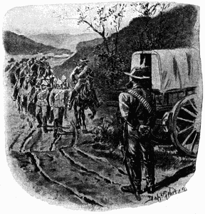 Als sich nach der Beendigung des nächtlichen Gottesdienstes unter den Familien der hier versammelten Buern die Nachricht verbreitete, daß Pieter Maritz allein zurückgekehrt war und seinen Vater verloren hatte, da erhob sich allgemeines Klagen. Es war ein schlimmer Tag gewesen. Außer Andries Buurman, der in der Höhle von Makapanspoort sein Leben ausgehaucht hatte, war noch ein anderer tapferer Mann im Kampfe tot geblieben, und drei Buern lagen an ihren Wunden danieder. Klaas Buurman, der Bruder des Andries und Oheim des Knaben Pieter Maritz, ließ sich von seinem Neffen erzählen, was geschehen war, und führte ihn dann zu einem der großen Wagen, wo die Familie des Verstorbenen wohnte. Hier lagen des Knaben jüngere Geschwister, eine stattliche Schar von fünf Knaben und drei Mädchen, in sanftem Schlummer unter der schirmenden, hochgewölbten Decke, neben dem Wagen aber war eine Frau von starkem Wuchse eifrig beschäftigt, für die Zugochsen zu sorgen. Zwei Schwarze in wollenen Hemden mit nackten Armen und Beinen gingen ihr dabei gehorsam zur Hand, schütteten den Tieren Heu vor, gaben ihnen Wasser und wuschen ihnen die vom Joche wund gedrückten starken Nacken.[S. 15] So erfüllte die wackere Gattin außer den Pflichten der Mutter auch die des Hausherrn.