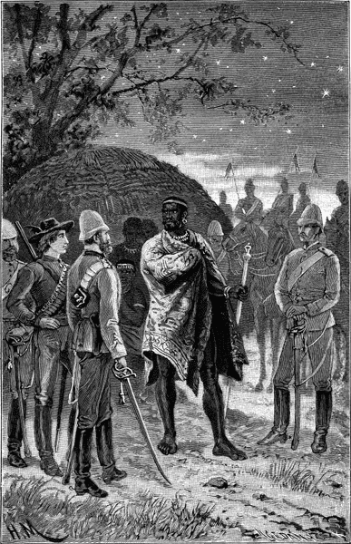 »Ich beschwöre Euch, Baas, laßt diese Leute in Frieden,« entgegnete der Missionar. »Sie sind Abgesandte Tschetschwajos, des mächtigen Zulukönigs, und sie haben friedliche Absichten. Sie sind ausgesandt, um sich nach dem Christentum zu erkundigen, und ich erkenne die Liebe Jesu Christi darin, daß er das Herz des wilden Tschetschwajo gelenkt hat.«
