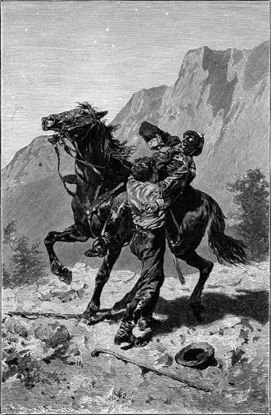 Die Strahlen der Sonne fielen in blendender Klarheit vom unbewölkten Himmel herab und erzeugten in dem engen Thale eine brennende Glut. Nur langsam bewegte der kleine Zug sich vorwärts, das Pferd ging einen müden Schritt, der Reiter hatte sein bärtiges Haupt auf die Brust gesenkt, und der Knabe, welcher mit einer Hand den Steigbügelriemen gefaßt hatte, blickte oft voll Besorgnis zu dem Gesicht des Mannes empor.