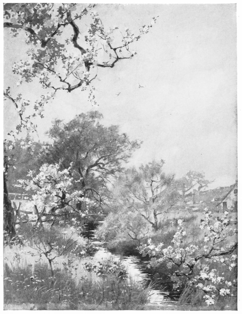 “He would picture the clouds and the mists, the mountain-tops arresting the fogs and condensing them{259} with its ledges; the little springs which run among the hills, the river’s cradle among the rocks, the tiny brook descending over the desolation of the heights, the brooklet entering the forest, the mossy coverts, the fern-covered banks, the shadowing trees, the twisting, turning stream, winding downward amidst tawny rocks, jumping over cataracts and falls, then emerging into the lower pasture slopes, with cattle drinking at its banks, and then the meadows with great sweeping branches of overhanging trees, the vexing wheels of mills, the larger and larger river, and then the city with its grime, and beyond, the sea, with its mighty ships sailing to far Cathay. And how his wondrous eyes, which had the luminousness but never the passion of the flame, used to glow as he talked of Nature and of the secrets that she told him and of the apostleship he held to make the great world see and love Nature with something of his idolatry. He kept the gladness of his youth and was never won away from the paths in which his boyish feet had strayed. That wondrous picture-making period of boyhood ever held his soul in thrall. He lived in the city, for he was the busiest worker among men, but the roots of his heart were tangled with the grasses of the sunlit pastures where his youth had been. When the sun’s rays lengthened over the noisy city, with the swiftness of the arrow’s flight from a Tartar’s bow he sought the old scenes, and there at length when{260} favoring fortune came, he built his home, and when death wanted him she sought him there, and there she found him.”