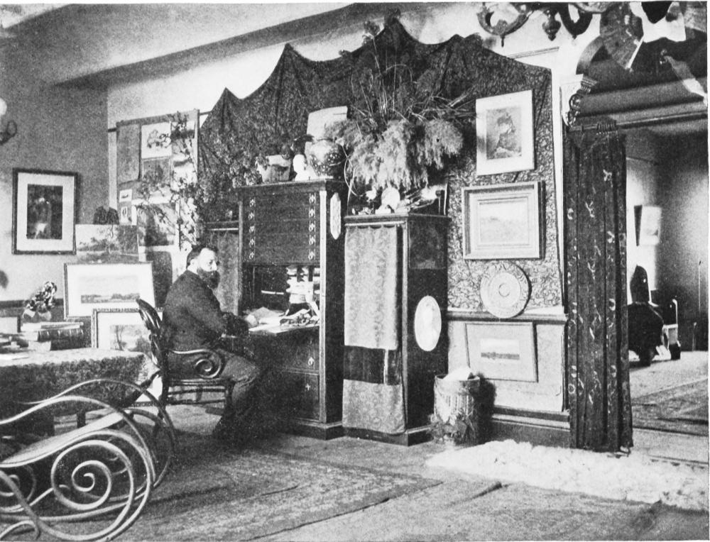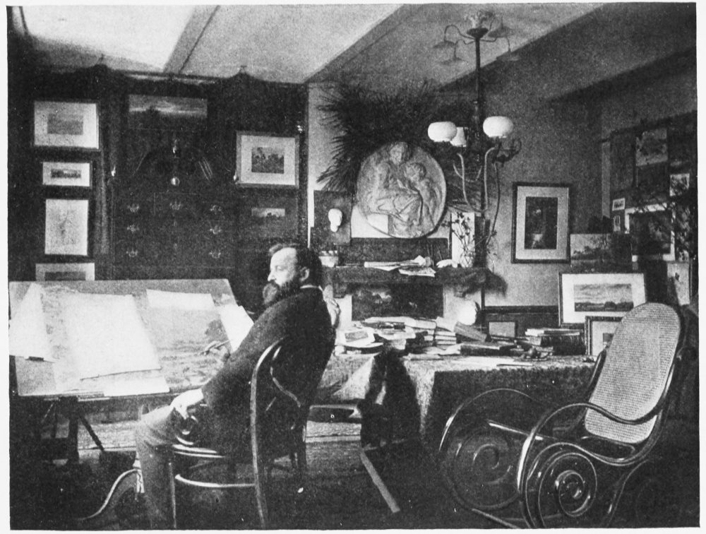 “As an artist he was quite as free from personal mannerisms or eccentricities. When I first visited his studio on Montague street, Brooklyn, he talked as he worked—the picture was an illustration to one of his magazine papers,—and afterwards turned to his portfolio, quite without the effect of entertaining me, but always with a companionly frankness and simplicity that made him at all times the most attractive of hosts. I remember his house studio on Lincoln Place by but two visits, and I had no greater acquaintance with the little crib at the foot of the Washington lawn. I think I liked the dishevelled workshop at Washington best of all.