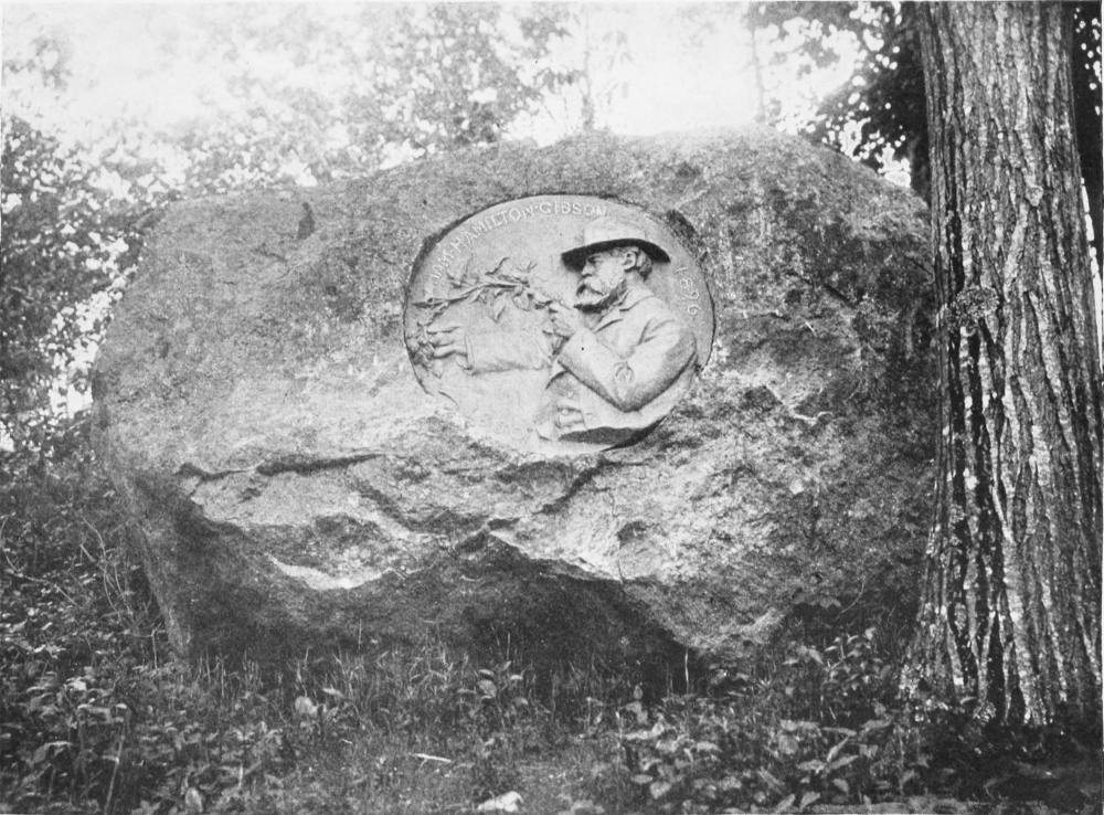It was four years after his death that the Alumni and friends of the “Gunnery” school completed a memorial of Gibson which for fitness and significance is one of the most successful in America. On the left of the road, as one climbs the long hill from the railroad{266} station to Washington Green, nearly at the top of the slope, there stands a large boulder, a little back from the highway. Here it was determined to place a bronze medallion in bas-relief, which should aim to suggest the man and commemorate his relation to the little town which he so loved and which so loved him.