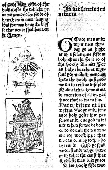 | V. | Types 5, 7 (see pp. 243–4). The text of f2v of the Festial, printed in 1486 7 (?), showing one of the smaller woodcuts and the woodcut capital G |