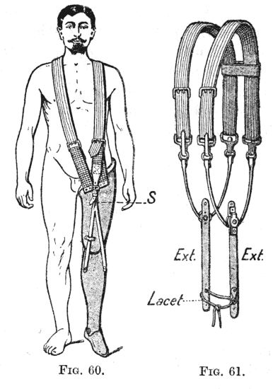 1. The use of a sling which passing over the shoulders is attached to the leg below the knee in such a way as to act as a mechanism for extending the knee.