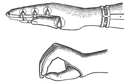In artificial arms the differences between the French and English patterns are greater than in artificial legs. But here again the principles remain the same. In England, also, we have worker's arms and show arms, but the latter tend to be more elaborate than the French patterns, mechanical movements being more developed. For this reason this pattern is usually called, in England, the mechanical arm. Instead of the single cord, looped round the opposite shoulder, and used to open the spring thumb (see p. 101), at least three such cords are used, actuated (1) by rounding the back; (2) by expanding the upper part of the chest, and (3) by raising or lowering the shoulder[xvii] on the side of the amputation. These may be used for various purposes, of which the chief are (1) flexing the artificial elbow; (2) working the elbow lock, and (3) actuating the thumb, fingers or appliances used instead of the hand. The chief other differences in the methods adopted in England are—