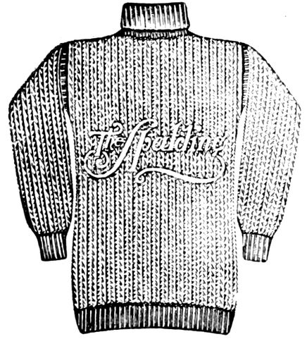 | No. 12PX. Worsted, solid stock color body, with stock color striped sleeves, usually alternating two inches of same color as body, with narrow stripes of any other stock color. | Each, $3.00 |