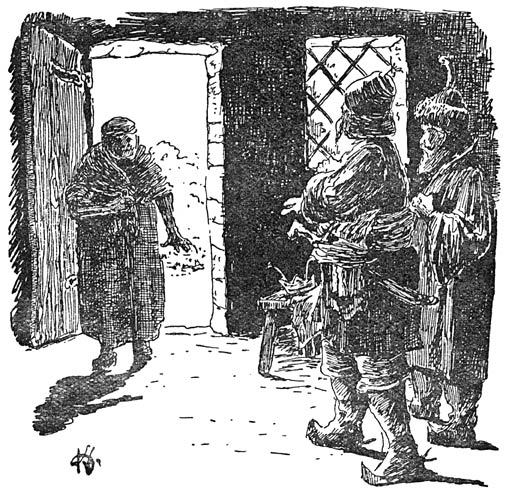 Ze renden nog harder voort. ’t Ging als de wind. Juist toen ze voor de deur van moeder Guldratsj’ hutje van hun paarden wilden springen werd de deur geopend en ’n man trad naar buiten. Hij had ’n zwarte mantel om en achter hem aan kwamen langzaam uit de deur vier mannen die ’n baar droegen waarover ’n zwart kleed lag.