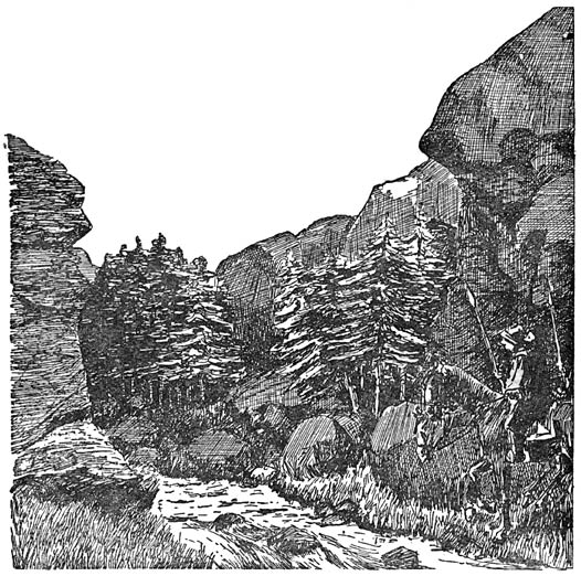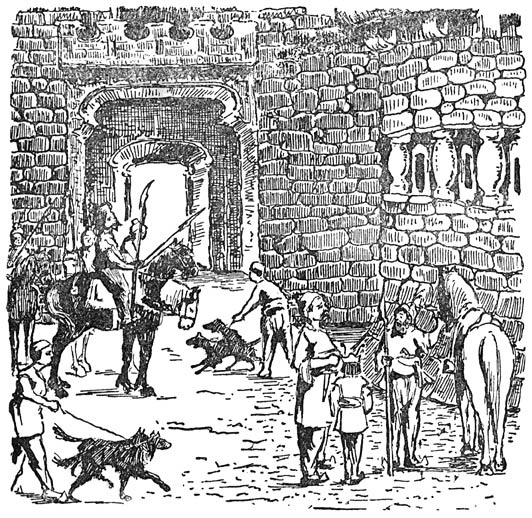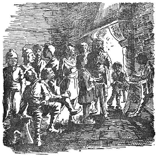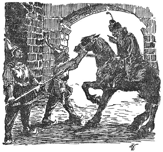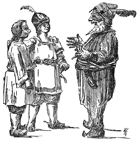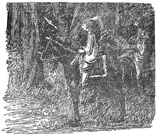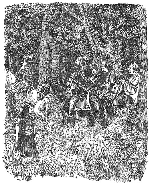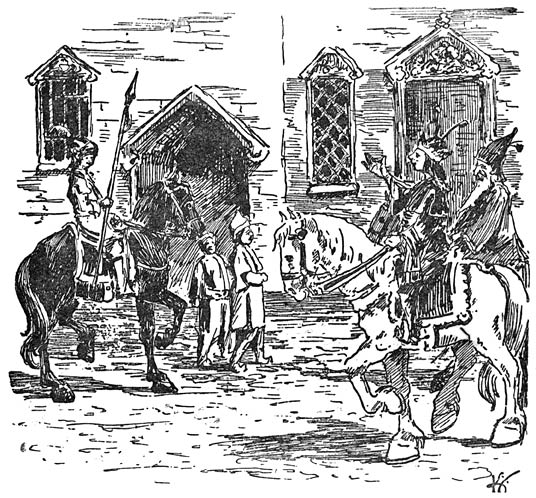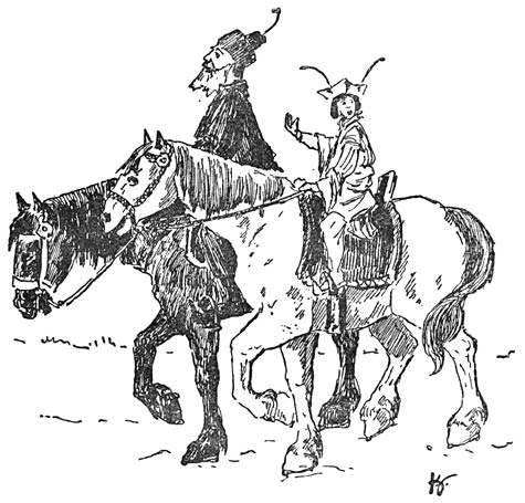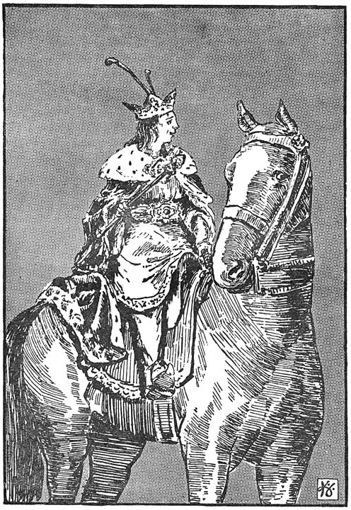 De volgende morgen stegen ze weer vroeg te paard en zoo ging het veertien dagen lang. Ze trokken door dalen en over berger, door groene bosschen en langs donkere akkers en lichte weiden en kwamen zonder ongevallen in ’t land Huk aan.
