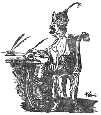 De keizer was er zoo nu en dan evenwel zelf ’t slechtst aan toe met die onuitsprekelijke naam. In de wandeling heette hij Napo en zóó onderteekende hij ook gewoonlijk z’n brieven. Doch als hij ’n nieuwe wet moest onderschrijven of ’n keizerlijk besluit, dan kon ’t niet anders of hij moest z’n naam er voluit onderzetten. Dat hadden z’n honderdzevenenzestig voorvaderen ook gedaan, doch ’t bleef ’n wanhopig karwei. Als hij er mee klaar was kon [7]er geen enkele krul meer op overschieten, wat toch bij ’n nette handteekening hoort. Maar wat moet je beginnen, als je geen inkt meer in je pen hebt en je bovendien blij ben, dat ’t afgeloopen is? Want om met één pennetrek te schrijven: Napoleonidasssurbanusaranatanielfridammonnottorobiodecastrobertus CLXVIII en dán nog weer eens in te doopen voor ’n krul, terwijl je van blijdschap hè roept, omdat je gelukkig over de eindstreep ben, dàt doet geen mensch.