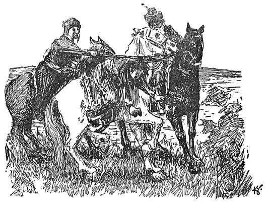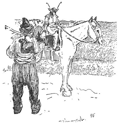 „Kom je zal nou wel genoeg hebben,” zei Abé ’n beetje grommig tegen z’n beest. Hij deed hem ’t bit weer in de bek en steeg weer op. Die honger kon hij niet verdragen. Hij moest eten hebben, al zou ’t ook z’n laatste duit kosten.