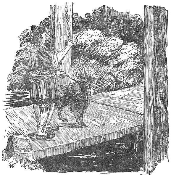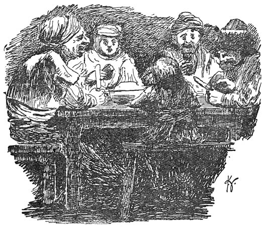 Karibo zorgde er voor dat Abé ’t in z’n afwezigheid goed zou hebben. Hij besprak de zaak met de [20]waard en de waardin en die beloofde hem op Abé te zullen passen alsof het hun eigen zoon was. Tamelijk gerust vertrok hij dan ook heel in de vroegte naar Pomfriet en nu zat Abé heelemaal alleen.