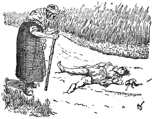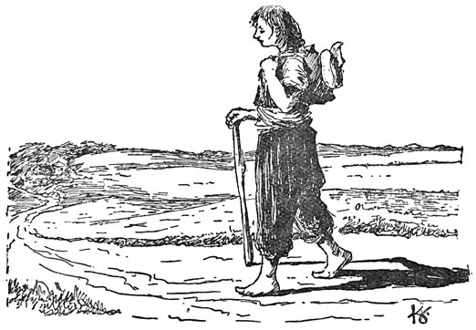 ’n Eind verder zag Abé ’n blauwe zak op de weg liggen. Die had de landman bepaald verloren van de stok, die hij over de schouder droeg en waaraan Abé ook ’n aarden kruik had zien bengelen. Daar zat brood in. ’t Was alsof iemand dat in Abé z’n ooren schreeuwde.