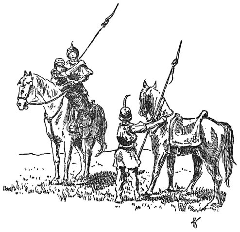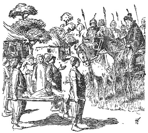 Abé en Karibo bereden ’n paar groote stevige paarden. Dat was wel noodig want de weg was lang. Karibo had uitgerekend, dat ze minstens veertien dagen noodig zouden hebben om de meest nabije stad in ’t land Huk te bereiken. Ze hadden ook wel van ’n wagen gebruik kunnen maken. Maar vooreerst waren in Abé’s tijd de wagens zulke gemakkelijke voertuigen niet en ten tweede reden mannen liefst te paard. Heel erg was ’t ook niet. Abé kon goed rijden en ze hoefden zich volstrekt niet te haasten. Als ze eens draven wilden deden ze dat [16]voor hun plezier. Waren ze ’t in het zadel een beetje moe, dan belette niets hen ’n eindje te voet te gaan met hun paard aan de teugel of ’n poosje in ’t hooge gras te gaan liggen langs den weg. Hun bagage hadden ze achter zich op ’t zadel. Heel veel was ’t niet, niet meer dan ’t hoognoodige. Doch ’t voornaamste droeg Karibo in z’n gordeltasch. Dat waren perkamenten waaruit duidelijk bleek wie Abé was en goudstukken. ’t Spreekt van zelf dat ze beiden goed gewapend waren, want heel onmogelijk was ’t niet in die tijd, dat ’n paar eenzame reizigers door slecht volk overvallen werden en uitgeplunderd. Karibo was wel grijs, maar toch nog ’n sterke kerel, die als oud soldaat heel goed met ’t zwaard wist om te gaan en Abé, al was ie nog pas twaalf jaar, kon er ook best mee terecht. Dat had hij van z’n vader en van Karibo geleerd. En bang waren ze geen van beiden.