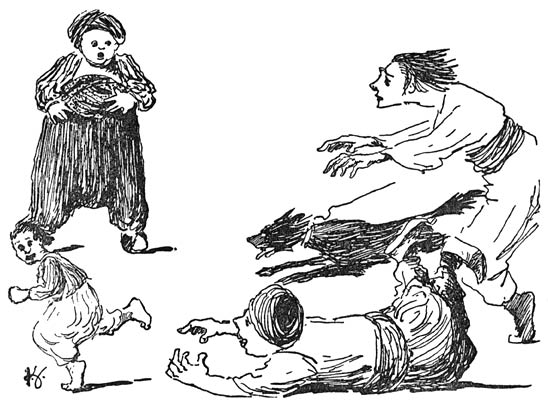 Doch ’t ergste was, dat ’n neef van de keizer in troebel water aan ’t visschen was. Hij had zelf veel zin om ook eens keizer van Huk te worden. Zoolang er geen opvolger was, had hij nog kans gehad, maar de geboorte van prins Abecé maakte daaraan een eind. Nu die kans verkeken was stookte hij in stilte de opgewonden menschen tegen de keizer en ’t onschuldige prinsje op om zóó tot z’n doel te geraken. Hij liet overal rondstrooien, dat hij ’n extra onuitsprekelijke naam zou aannemen indien ze hem uitriepen tot keizer en dat vonden de meeste Hukkers nu net wat ze hebben moesten. Zoo kwam het dat de soldaten van de keizer gemeene zaak met de oproerlingen maakten en eer Abecé ’n maand oud was zat er voor de rechtmatige keizer van Huk niets anders meer op dan stilletjes midden in de nacht op de vlucht te gaan. Hij kon niets anders mee nemen dan z’n vrouw, ’t prinsje en ’n paar bedienden, die hem trouw gebleven waren.