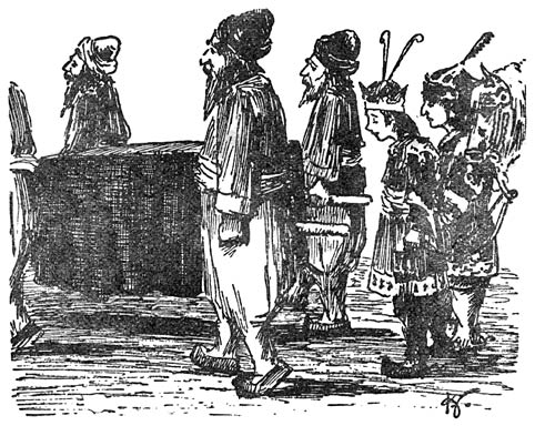 En zoo zat de keizer van Huk dan op ’n goeie dag op z’n troon met ’n grommig gezicht en de heele zaal zat vol raadsheeren en andere hooge lui, óók allemaal met grommige gezichten. Want ze hielden vergadering en de keizer stond op z’n stuk, dat de kroonprins ’n gemakkelijke naam zou krijgen en al die andere hielden vol, dat ’t niet kon.