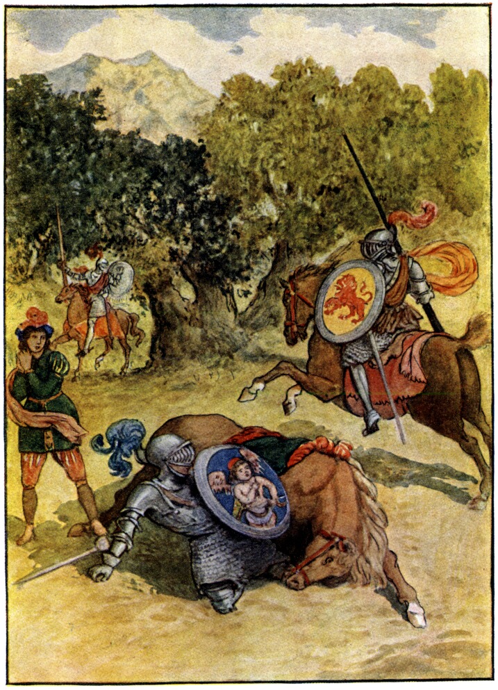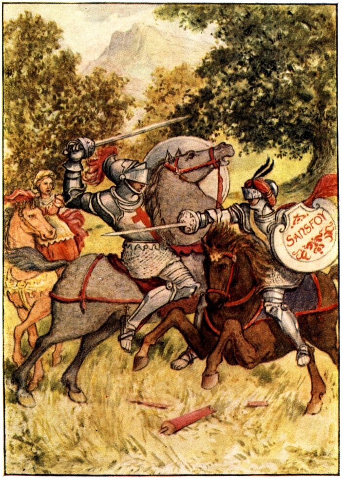So the two rode on together. They had not travelled many miles when they saw coming to them, riding at the full speed of his horse a knight fully armed. When he came near they saw that he was a man of very fierce aspect, and that he carried on his shield the name Sansloy. Fierce as he was of look, he grew fiercer yet when he perceived the false knight’s shield, how it had the badge of the Red Cross. Not a word did he speak, but he laid his spear in rest and rode fiercely forward.