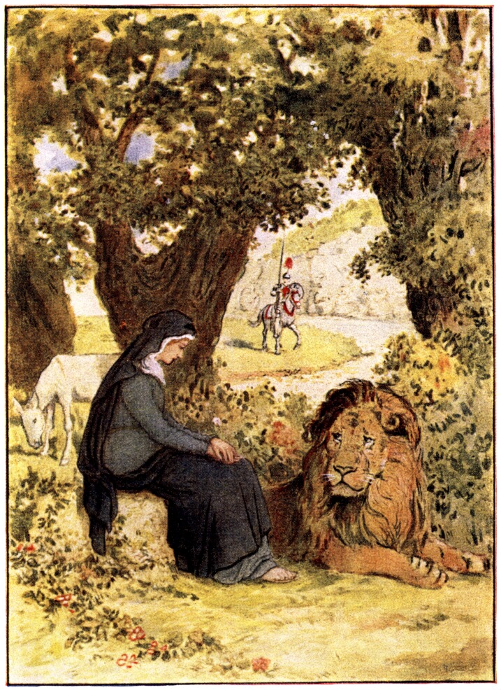 On a certain day she lighted off the ass, on which she was wont to ride, and laid herself down to rest in a solitary place, under the shadow of a tree; she took the covering from her head, and laid aside her black cloak; her faithful beast grazed hard by, for there was much grass in the place. As she lay, there rushed out of the wood with which the meadow was circled about a furious lion. Wild he was with hunger, and was hunting for prey. And when he saw the royal maid, he ran greedily at her with open mouth, as if he would have devoured her; but when he came near, and saw what manner of maid she was, all his rage departed from him. He kissed her weary feet, and licked with his tongue her lily hands, crouching down before her as if to show himself her servant. At the first sight of the beast the Lady Una was not a little afraid, but when she saw how gently he bore himself, she sighed and said: “See now, how this lion, who is the king of the forest, forgets his hunger and his rage in pity of my sad state, while he who was my champion leaves me to wander alone.” So she spake till she could speak no more for very tears, and the lion meanwhile stood looking upon her. Then—for the lady was of a brave spirit—she shut up her sorrows in her heart, and mounted on her steed again, and set out once more upon her quest. It was a long and weary way which she went, through divers places, where there were no inhabitants, and still the lion went with her, ready to guard her against all dangers. While she slept, he watched over her, and when she awaked he awaited her command, watching her eyes so that he might discern her pleasure.