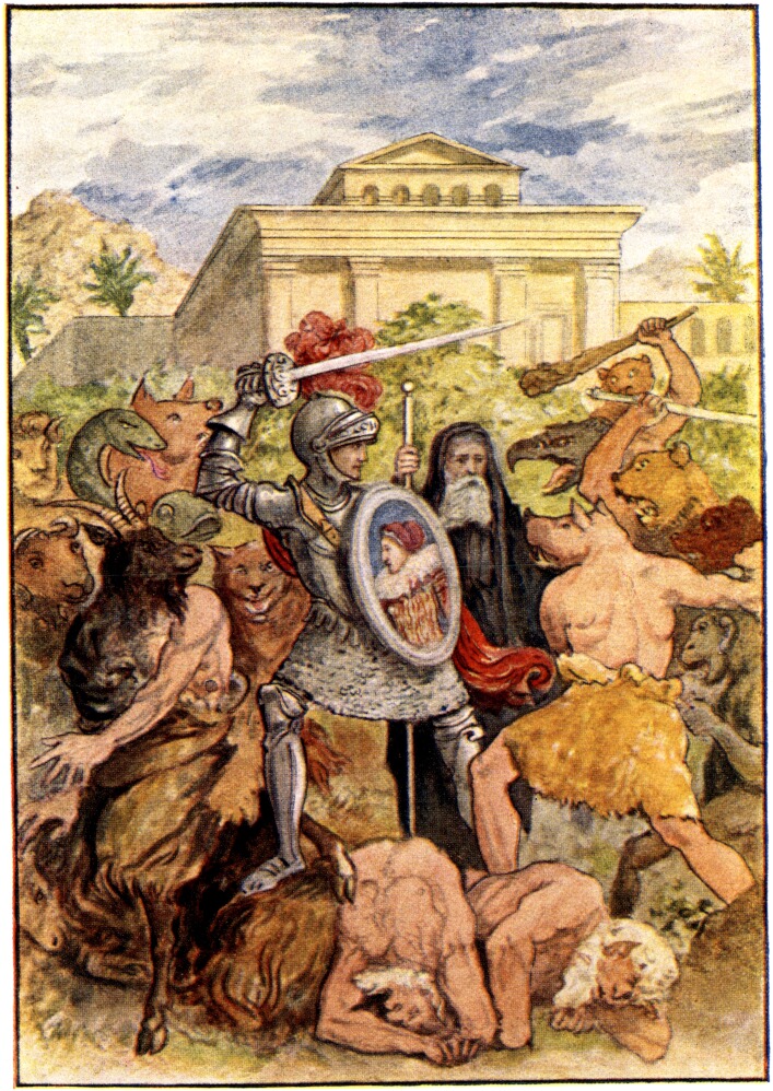 Greatly was his heart stirred within him with grief and anger, and, knitting all his strength together, he gripped the creature by the throat so mightily that she was constrained to loosen the bonds which she had cast about him. And yet, it had well-nigh cost him dear to come so close to the monster, so foul she was. And of this foulness the worst was this, that she caused to come forth out of her mouth, as in a flood, the brood which had taken shelter therein at the first. Serpents they were, like to their dam, small indeed, but full of venom, and they swarmed over him, twining themselves about his arms and legs, so that he could not strike a blow nor even move. So, in some still eventide, a shepherd, sitting to watch his flock, is suddenly assailed by a cloud of gnats; feeble creatures they are, and slight their sting, but they suffer him not to rest. The Red-Cross Knight was in a strait more dire, for these evil creatures had power to do him a more grievous harm. But he thought to himself, “Shall I be vanquished in this fashion?” He was somewhat moved by the danger wherein he stood, but more ashamed that he should be overcome in so foul a fashion. So, resolved in his heart that he would put all his strength into a stroke, either to win or to lose, he gathered himself together, and struck the monster with a blow so fierce that he shore the head from the body, and she fell dead upon the ground.