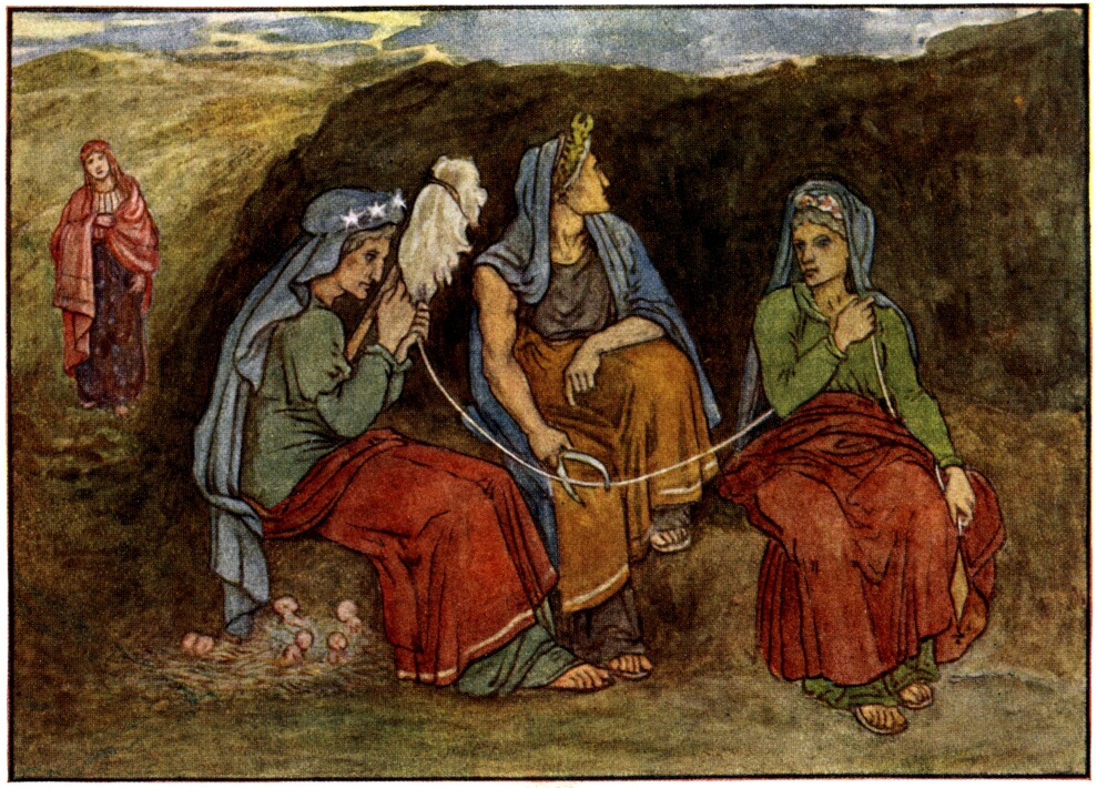 “Sir,” she answered, weeping the while, “I have suffered much from evil fortune. I was the only daughter of an emperor, who had wide dominion over the land of the West, setting his throne where flows the famous stream of Tiber. Being such, I was betrothed in my early youth to the only son and heir of a most wise and mighty king. Never surely was prince so fair and faithful as he, never one so gentle and debonair. But alas! ere the day appointed for our marriage came, my lord fell into the hands of cruel enemies, and was most foully slain. When this ill news came to me, I said to myself: ‘Now will I at least do due honour to the dear body of him whom I loved.’ So I set forth from my father’s house upon this quest. Long did I wander over the world, a virgin widow, nor did I find that for which I sought. At last I chanced to meet this Saracen, who now lies dead upon the plain. He constrained me to go with him, and would fain have won me for his wife, but I ever said him nay. And now he lies dead. An evil man he was, one of an evil brotherhood of three—Sansloy, the eldest; Sansjoy, the youngest; and this Sansfoy, of middle age between the two.”