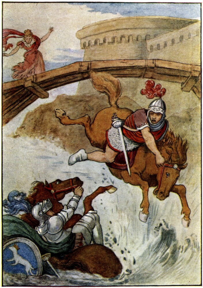 When Sir Calepine had won in safety to the farther bank, he called aloud to the other, saying, “Unknightly man, disgrace to all who bear arms, I defy you. Fight if you dare, or never be bold to bear arms again.” But the fellow took no heed of this challenge, but laughed aloud, as if to say that his adversary was of so mean estate that a man of honour need not trouble to regard his words. So, crossing the stream, he came to the fair house on the farther bank, for indeed this was his house.