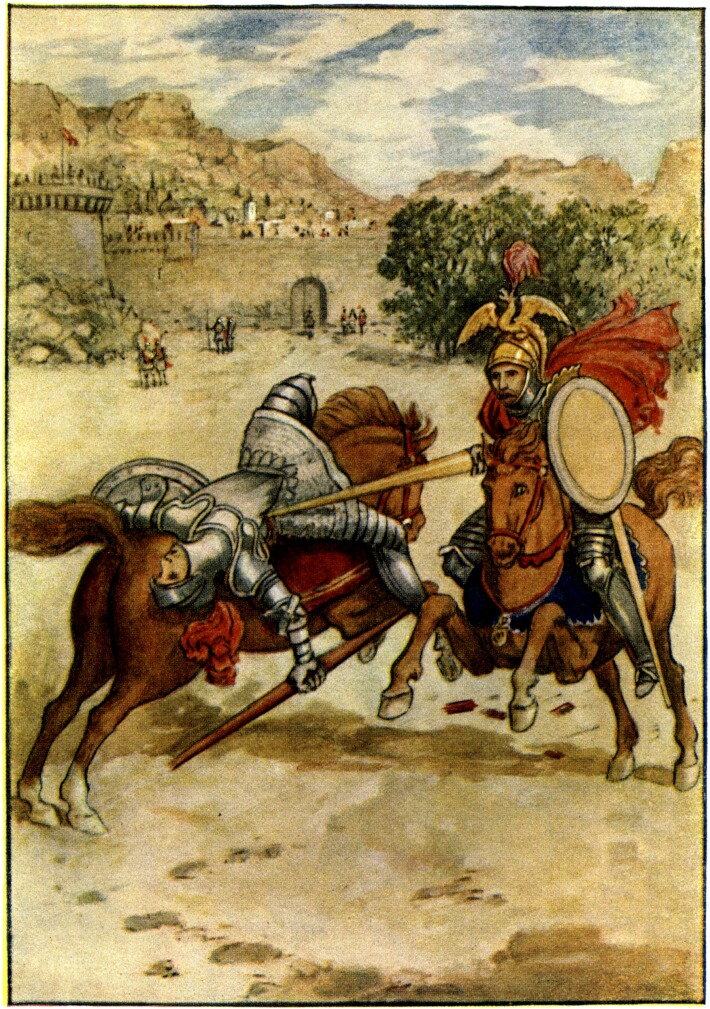 So saying, he dealt a blow so fierce that it shore away half the Christian’s crest, yet glancing down upon the shield harmed him no more. Yet was it not struck in vain, for it roused him of the Red Cross to such rage that he made a more than like reply. Full on the Saracen’s helmet he dealt his stroke. Right through the steel it passed, and cleft the head, so that the Saracen fell a dead man from his horse.