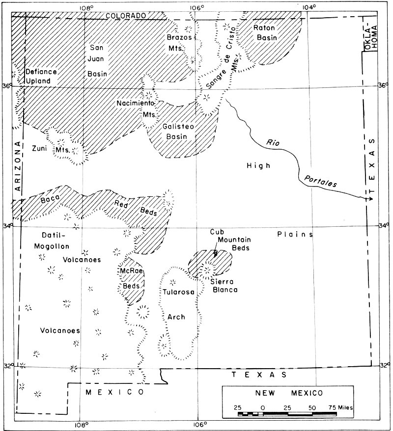 Mines and derricks are ever-present aspects of New Mexico’s landscapes; they are seen by every citizen of the state and every tourist as he travels across the plains, valleys, and mountains. The derricks and the mine openings are merely surface features through which the vast wealth of the underground is exploited, but they are a monetarily important part of New Mexico’s scenery, rocks, and history.