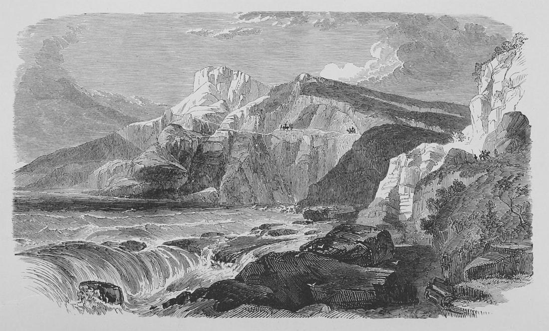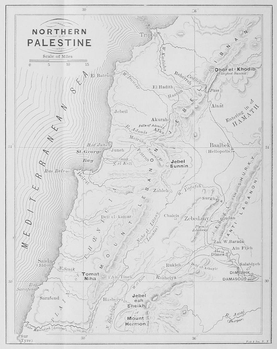 But whatever is beautiful in the scenery of Palestine is peculiar to the north. In the south there is a sameness of outline and of color that wearies the eye and makes one sigh for variety; but north of the mountains of Ephraim the beholder is charmed with green plains and fertile valleys, with wooded dells and graceful hills, with rippling brooks and sylvan lakes, with leaping cascades and rushing rivers, with sublime chasms and profound ravines; and with lofty mountains, broken into beetling cliffs and craggy peaks, whose higher summits are capped with perpetual snow, and down whose furrowed sides rush a thousand torrents. There the most fastidious taste would be delighted with the wild mountain gorge encircling Tirzah, and the wilder chasm of el-Hamâm—with the beautiful glen of el-Haramîyeh, and the more lovely Vale of Abilîn—with the woodland parks of Carmel and Tabor—with the crystal lakes of Merom and Gennesaret—with the foaming, rapid waters of the Jordan, the Leontes, and the Adonis—with Mount Hermon, with summer at his feet, spring in his lap, and winter on his head—and with the magnificent scenery of Kadîsha, where the Syrian Alps lift their awful forms 13,000 feet high, covered with snow 100 feet deep—where the melting snows feed cascades, which in their descent are beaten into spray by the rocks, and which, reflecting the sunlight, seem like the infinite fragments of some gorgeous rainbow—and where rills from the hills and torrents from the mountains unite to swell the river below, which, after winding through the noblest and wildest of nature’s chasms, whose sides are lined with shrubbery, adorned with hamlets, and dotted with convents high up in the everlasting rocks, and whose solemn bells awaken the echoes of Lebanon, pours its accumulated waters into the Western Sea.