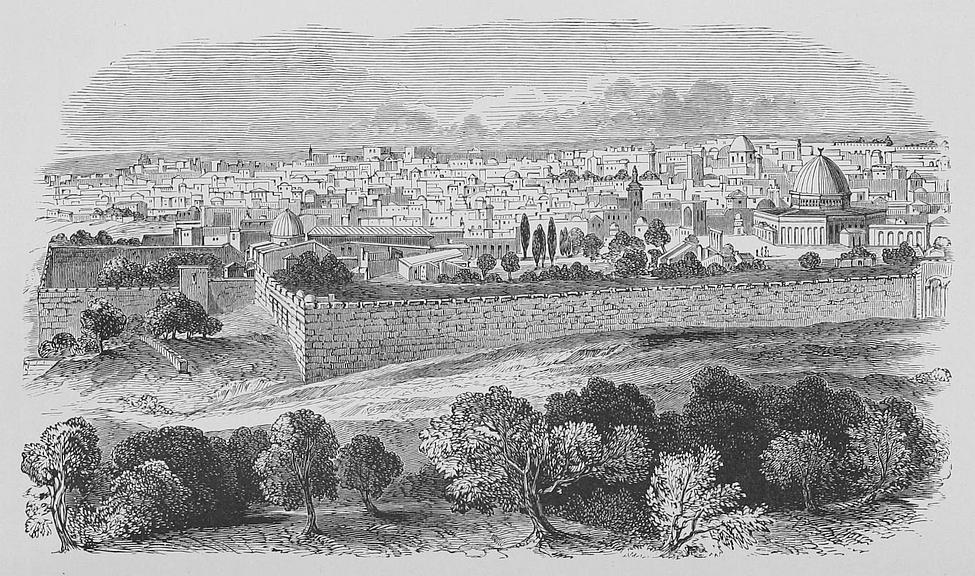 In my visits to the holy city I experienced a keen regret that I was not treading the streets trodden by Christ and his apostles. They are hidden beneath the accumulated rubbish of ages. As I walked the crooked, neglected lanes of modern Jerusalem I felt I was treading upon the buried temples and palaces and avenues of Solomon’s glorious reign which await a resurrection by the spade, when the crescent goes down and the cross goes up. The regret I had experienced was relieved when I stood upon Mount Moriah, whose summit remains in its form and aspect as when Jesus “walked in Solomon’s Porch;” or when I crossed the little stone bridge which spans the Kedron, so often pressed by his weary feet; or when I sat on the slopes of Olivet and “beheld the city” which in its former majesty and glory rose before his divine vision.