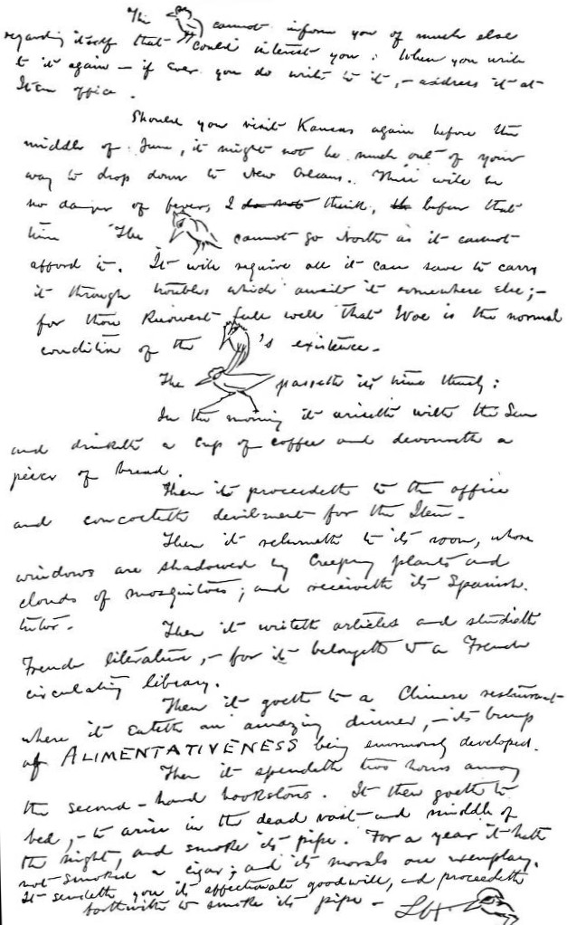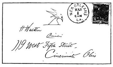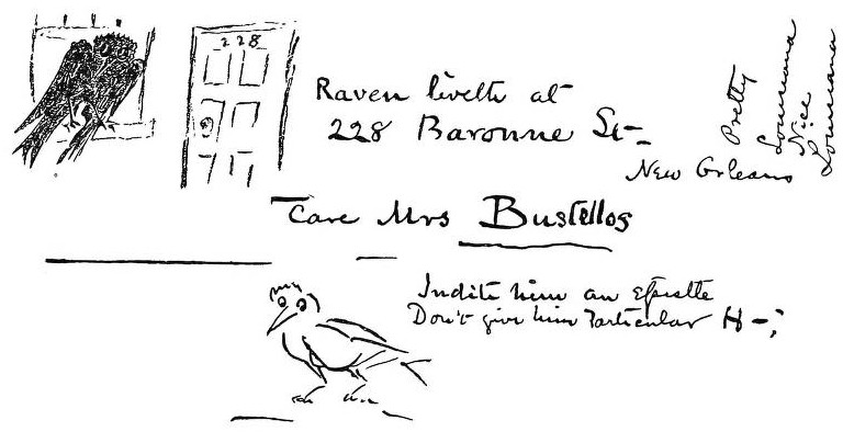 It was in October, 1877, that Hearn set out from Cincinnati on his way to New Orleans, going by rail to Memphis, whence he took the steamboat Thompson Dean down the Mississippi River to his destination. While in Memphis, impatiently waiting for his steamer to arrive, and afterwards in New Orleans, Hearn kept himself in touch with his friend in Cincinnati by means of a series of messages hastily scribbled on postal cards. Many of these reflected the animal spirits of the young man of twenty-seven, who had still preserved a goodly quantity of his boyishness, though he felt, as he said, as old as the moon. But not all of the little messages were gay. The tendency to despondency and morbidity, which had partially led Mr. Watkin to dub Hearn "The Raven," now showed itself. The first of these cards, which Mr. Watkin has preserved, was sent from Memphis on October 28, 1877. It bears two drawings of a raven. In one the eyes are very thoughtful. The raven is scratching its head with its claws, and below is the legend, "In a dilemma at Memphis." The other raven is merely labelled, "Remorseful." The next was sent on October 29. Hearn had begun to worry. He wrote: