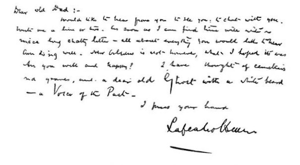 Mr. Watkin one day left a card for possible customers: "Gone to supper. H. W." Hearn passed by and wrote on the opposite side of the card: "Gone to get my sable plumage plucked." The inevitable raven followed as signature. It was Hearn's way of saying he had come to see Mr. Watkin and had then gone to a barber shop to have his hair cut. Once he omitted the raven and signed his note, "Kaw."