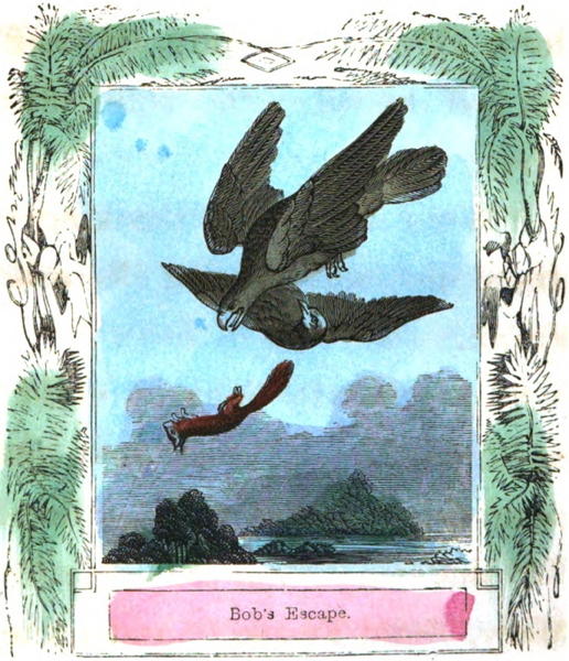 “An eagle, who had watched the whole affair, thought he would have a word in the matter. The King of Birds determined to seize both the captor and captive; so, sweeping along, he gave the raven a furious blow, but missed half his prize. The raven let poor Bob go, and down he went, down, down, down. Happily, the eagle left off hunting the squirrel, to pursue the raven.”