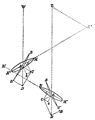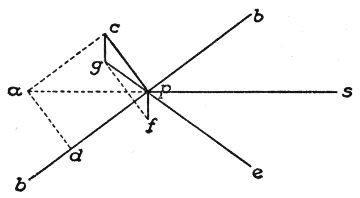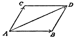 Nach diesem Satz der Mechanik können zwei Kräfte, die unter irgendeinem Winkel an einem Punkt angreifen, durch eine Mittelkraft, die Resultante, ersetzt werden, die ihrer Größe und Richtung nach gleich ist der Diagonale des Parallelogramms das aus den Seitenkräften und dem von ihnen eingeschlossenen Winkel konstruiert wird. AC und AB seien die Seitenkräfte oder Komponenten, die auf A wirken; dann ist AD die Resultante. Ein Boot z. B., das durch den Wind oder die Dampfkraft allein quer über den Fluß von A nach C, durch die Strömung allein in der gleichen Zeit stromabwärts von A nach B getrieben würde, wird durch beide zugleich auf dem Weg AD zu dem weiter stromabwärts gelegenen Punkte D des jenseits gelegenen Ufers gelangen. Beim Schlag ist die Sachlage umgekehrt; hier ist die Resultante AD mit der Stärke und Richtung des Schlages gegeben, so daß es nunmehr gilt, sie in 2 Komponenten zu zerlegen, die zusammen dieselbe Wirkung hervorrufen wie jene allein. Das ist aus dem Grund ein schwieriges Beginnen, weil die Komponenten jede beliebige Richtung annehmen können. Eine bestimmte Lösung ist erst möglich, wenn die Komponenten bestimmte Voraussetzungen nach Richtung und Größe erfüllen. In der Praxis des Schlagens sind diese Unbekannten in der Härte und der Struktur des Steines, der Länge und Stärke des beabsichtigten Absplisses begründet, mit denen also jeder Schlagkünstler rechnen muß.