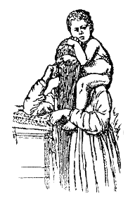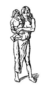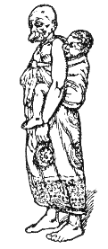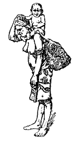 Die einfachsten Tragweisen sehen noch von außerkörperlichen Geräten ab, indem das Kind mit Hilfe eines oder beider Arme an der Brust, auf der Hüfte (Abb. 1) oder auf der Schulter (Abb. 2) getragen wird. Eine Befreiung der Hand findet hierbei nur teilweise statt, weshalb die Bevorzugung einer bestimmten Körperseite noch nicht festzustellen ist; die Mutter trägt das Kind ebenso oft links wie rechts. Als Regel kann gelten, daß diese Methode gegenwärtig nur noch vorübergehend angewendet wird. Hier und da reitet das Kind auch auf dem Nacken der Mutter, mit den Beinchen nach vorn über deren Brust hinab (Abb. 3), oder es reitet »Huckepack« auf dem Rücken. Hierbei werden beide mütterliche Arme zum Tragen beansprucht, während sie dort zwar frei bleiben, aber zu lebhafter Arbeit gleichwohl kaum verwandt werden dürfen, da der kleine Reiter sonst leicht zu Boden stürzen könnte.