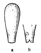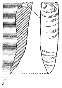 In der Praxis der Naturvölker von einst wie von heute spielt dieser senkrechte Schlag keine Rolle, wohl aber der schräge. Weitaus die meisten Feuersteinklingen des Paläolithikums zeigen, soweit sie von einem Nuklëus abgesplittert worden sind, an ihrem dickeren Ende eine auffällige Hervorwölbung mit zentralem, stets an der Kante liegendem Treffpunkt. Das ist der Schlagbuckel oder Schlaghügel, auch Bulbus oder Schlagzwiebel genannt, mit seinen konzentrischen Wellenringen und Längssprüngen, wie Abb. 10 sie zeigt. Er entsteht dadurch, daß der Hieb schräg auf die Fläche des Kernsteins erfolgt. Dann kann sich nur ein Teil des Kegelmantels ausbilden, indem auf dem von der Schlagfläche aus in spitzem Winkel abspringenden Abspliß nur ein Schlagbuckel entsteht. Ganz große Meister der jüngeren Hälfte der älteren Steinzeit haben auf diese Weise Feuersteinklingen fast von der Länge eines kleinen Schwertes abgeschlagen; aus Obsidian, dem vulkanischen Glas, bringen die Bewohner der Admiralitätsinseln im Norden des Bismarck-Archipels ganz gleiche Kunstwerke noch heute mühelos zuwege.