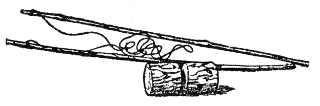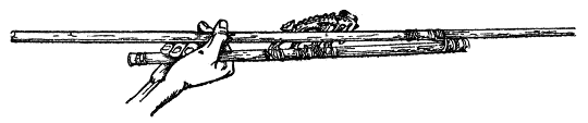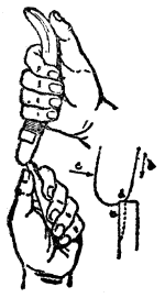 Auf demselben Satz vom Parallelogramm der Kräfte beruht auch jene andere Methode der Steinbearbeitung, wie sie bei den Feuerländern und Eskimo noch neuerdings beobachtet worden ist, und wie sie auch während des ganzen jüngeren Paläolithikums Verwendung gefunden hat. Das ist das Abdrücken von Splittern bei der feineren Bearbeitung der Steinklingen. Wie es bei den genannten amerikanischen Völkerschaften ausgeführt wird, habe ich bereits in den »Kulturelementen der Menschheit«, S. 25, unter Beifügung einer Abbildung beschrieben, die hier in Fig. 11 wiederholt sein mag. Es handelt sich dort um die Verwendung einer gebogenen Druckstange mit einem weicheren Einsatzstück, das man in bestimmtem Winkel auf die Kante des zu bearbeitenden Steins setzt, um nun durch einen starken Druck eine Lamelle zum Abspringen zu bringen. Der Leser begreift leicht, daß auch hier Richtung und Stärke des Drucks die Resultante darstellen; die eine der Komponenten verläuft dann tangential an der Schlagzwiebel, während die andere schräg durch den Abspliß geht. Ob die Paläolithiker den gleichen oder einen ähnlichen Apparat verwendet haben, läßt sich nicht mehr feststellen; das gleiche Prinzip haben sie indessen benutzt, auch wenn sie ihre Splitter nur mit einem einfachen Knochen oder einem Holzstab abgepreßt haben sollten.
