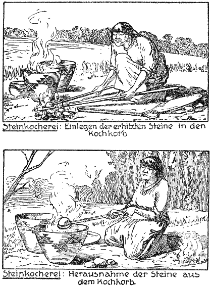 Bei dieser, äußerlich betrachtet, noch rein tierischen Lebensweise ist alsbald jener Fortschritt eingetreten, der unter der Bezeichnung der sexuellen oder geschlechtlichen Arbeitsteilung in der neueren völkerkundlichen und wirtschaftsgeschichtlichen Literatur einen so großen Raum einnimmt. Während der Mann auf Grund seiner ganzen körperlichen und geistigen Veranlagung dem Wilde folgte und den menschlichen Gegner bekämpfte, begnügte sich die Frau mehr mit dem Zusammentragen harmloserer Beute, deren Zubereitung ihr mit dem Augenblick mehr Sorge, aber auch mehr Befriedigung brachte, wo das Feuer in den Dienst der Menschheit trat. Mit Fug und Recht kann man ihr von diesem Moment an den Ehrentitel einer Hausfrau erteilen.