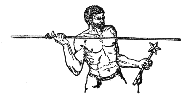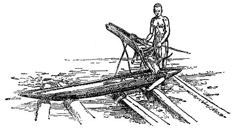 Mit Ausnahme der Rolle reicht die Verwendung einfacher Maschinen im Wirtschaftsleben der Menschheit ebenfalls bis in deren[S. 21] Frühzeit zurück, wie wir im Lauf unserer Betrachtungen mehrfach sehen werden. Schon das hölzerne Urgerät verknüpft ihrer zwei miteinander. Das ist der in der neueren Völkerkunde viel besprochene Grabstock, dessen wirtschaftsgeschichtliche Bedeutung ich bereits in der »Urgesellschaft und ihrer Lebensfürsorge« zu würdigen versucht habe. Physikalisch vereinigen sich in ihm die beiden Maschinen des Keils und des Hebels. Das Wesen des Keils ist jedermann bekannt; er ist ein dreiseitiges Prisma, das mit einer Kante zwischen zwei Körper dringt, um diese vermöge einer auf seinem Rücken zur Wirkung gelangenden Kraft voneinander zu entfernen. Man kann ihn als ein System von zwei schiefen Ebenen auffassen, die mit ihren Grundflächen aneinander gelagert sind. Die Wirkung, allerdings auch der Weg, ist um so größer, je beträchtlicher die Seitenlänge des Keils im Verhältnis zu seinem Rücken, d. h. je spitzer oder schärfer er ist. Unter einem Hebel verstehen wir jeden um einen festen Punkt oder eine feste Achse drehbaren Körper, an dem Kräfte wirken. Schaukelbrett und Brecheisen sind gemeinverständliche Hinweise auf sein Wesen.