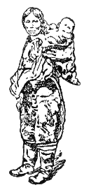 Die endgültige Lösung des Problems bringen erst die höchst mannigfaltigen Tragvorrichtungen, bei denen das Kind am Körper der Mutter hängt, ohne überhaupt einen Arm in Mitleidenschaft zu ziehen. Für große Teile Afrikas ist die Unterbringung des Säuglings in dem bekannten Rückentuche bezeichnend, worin der ganze Körper warm und geschützt in der Höhe des mütterlichen Kreuzes kauert, während die Beinchen rechts und links heraushängen (Abb. 5). Das Kind nimmt in dieser Lage an jeder Bewegung der Mutter teil, ohne diese im geringsten zu behindern und auch ohne selbst den geringsten Schaden an Körper und Geist zu erleiden. Andere Rückentragvorrichtungen finden sich in den mannigfachsten Konstruktionen über die ganze Erde hin verbreitet bis zu der großen Pelzkapuze der Eskimofrauen (Abb. 6) und der kunstvollen Tragwiege vieler Amerikaner und Nordasiaten. Der Rücken hat sich bei den tastenden Versuchen der geplagten Mütter nach einer Befreiung der Hände schon aus dem Grund als der geeignetste Ort erwiesen, weil die Last hier dem eigentlichen Arbeitsbereich räumlich am weitesten entrückt ist. Außerdem gewährt die Unterbringung der Last auf ihm die beste Möglichkeit, den eigenen Körper im Gleichgewicht zu erhalten.