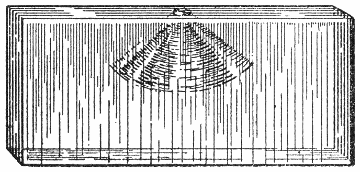 Das Weimarer Museum ist auch hier wieder mit praktischen Versuchen vorbildlich vorangegangen, indem es die Sprung- und Splittererscheinungen des Feuersteins an durchsichtigem Glase studierte. Man benutzte dazu polierte Briefbeschwerer von Würfel- und Säulenform. Schlug man mit einem Treibhammer der Klempner, der eine kugelähnlich vorgewölbte Schlagfläche besitzt, senkrecht auf eine ebene Fläche, so entstand eine Figur, wie Abb. 9 sie zeigt: unter dem Treffpunkt entstand in dem Glas ein vollkommener Kegel von[S. 19] der Form einer Lampenglocke, der sich je nach der Heftigkeit des Schlages bis zur Basis des ganzen Körpers fortsetzte, so daß man den äußeren Glaskörper wie eine Haube abheben konnte. Das kommt daher, daß die Energie im Augenblick des Auftreffens auf den harten Körper nicht mehr ausschließlich nach unten wirken kann, sondern auch nach den Seiten ausstrahlen muß.[2] Die Resultante ist in ihre Komponenten zerlegt worden.