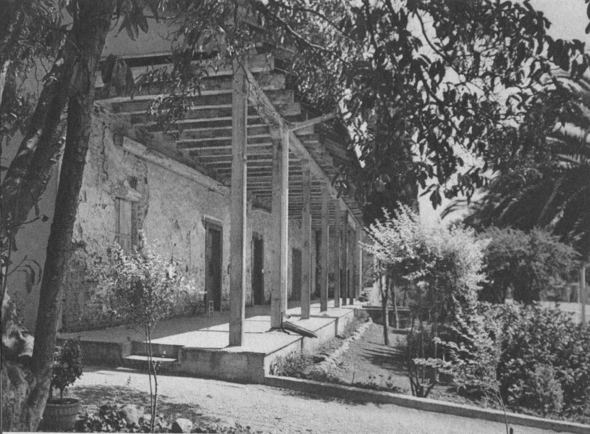 San Gabriel Arcángel was a welcomed pause in the long journey from Mexico to Monterey; it was the first stop after crossing the desert and mountains. It is distinctively Moorish in its architecture. Its high buttressed walls are stone to the windows and brick above and have an outside stairway to the choir loft and campanile. In the courtyard is one of the largest and oldest grape vines in California.