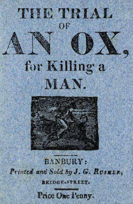 Then the Judge recapitulated the evidence, which appeared too clear to admit of a doubt, that the poor Ox was pricked and beaten in a most inhuman manner, by the drover, and that being driven to desperation by the cruel treatment, he turned suddenly round, and gored the hardhearted drover. Upon which, the Jury returned a Verdict of Manslaughter, and the Judge Fined him a Blade of Grass, ordered him to be Imprisoned an Hour, and then Discharged him, amid general acclamations.