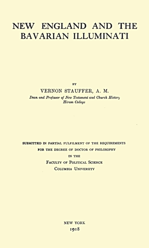 The Project Gutenberg EBook of New England and the Bavarian Illuminati, by Vernon Stauffer This eBook is for the use of anyone anywhere in the United States and most other parts of the world at no cost and with almost no restrictions whatsoever. You may copy it, give it away or re-use it under the terms of the Project Gutenberg License included with this eBook or online at www.gutenberg.org. If you are not located in the United States, you'll have to check the laws of the country where you are located before using this ebook. Title: New England and the Bavarian Illuminati Author: Vernon Stauffer Release Date: November 17, 2017 [EBook #55983] Language: English Character set encoding: UTF-8 *** START OF THIS PROJECT GUTENBERG EBOOK NEW ENGLAND AND THE BAVARIAN *** Produced by David Tipple, Mary Glenn Krause, Eric Lehtonen, University of Toronto's Robarts Library and the Online Distributed Proofreading Team at http://www.pgdp.net (This file was produced from images generously made available by The Internet Archive/American Libraries.)