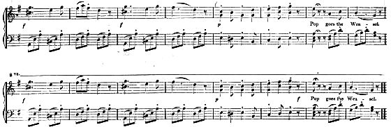 1st. Top couple down the middle and return. 8 Bars. 2d. Cast off outside and return. 8 Bars. 3d. The same couple execute hands three with the Lady next them. 8 Bars. 4th. Top couple raise their arms and the Lady passes under, at which time all sing Pop goes the Weasel 8 B's. 5th. The same couple repeat the last figure with the Lady's partner. 8 Bars. The same couple repeat till down line, after passing three or four couple the top commences till all are in motion.