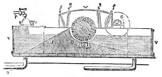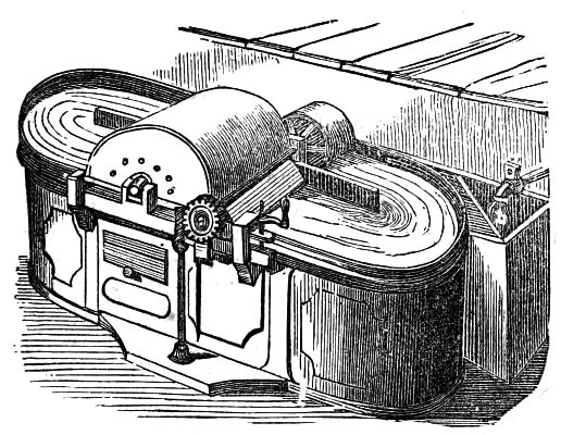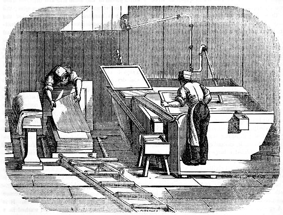 A species of paper was manufactured at a remote period in Egypt, from the papyrus or paper-reed, a plant growing freely on the banks of the Nile. A manufacture of paper from the bark of trees and other substances existed also in China from a very early date; but among the nations of antiquity, before the introduction of paper, such substitutes were used as lead, brass, bricks, and stone, on which national edicts and records were written or engraved; or tablets of wood, wax, and ivory, skins of fishes, intestines of serpents, backs of tortoises, and the inner bark of trees for ordinary purposes. Indeed, there are but few sorts of plants that have not been used for making paper and books, and hence have arisen the terms biblos, codex, liber, folium, tabula, tillura, philura, scheda, &c., which express the several parts of the plant which were written on. The use of these was discontinued in Europe after the invention of papyrus and parchment, but they are still used in other parts of the world. The two early kinds of manufacture above alluded to must first be noticed, before we describe the later invention of making paper from cotton and linen rags, which, in the greater part of the world, has superseded all other methods of producing a material for writing on. The Egyptian papyrus was made by laying thin plates of bark, taken from the middle of the paper-rush, side by side, but close together, on a hard, smooth table: other pieces of the same size and thinness were then laid across the first at right angles; the whole was moistened with the water of the Nile, which was supposed to have some agglutinating property (though this probably resided in the plant itself), and pressure was then applied for a certain number of hours. Thus a sheet of paper was formed which required no other finishing than rubbing and polishing with a smooth stone, or with a solid glass hemisphere, and drying in the sun. This very simple process was rather a preparation of a natural paper than a manufacture—properly so called. The process adopted by the Chinese comes more legitimately under that head. The small branches of a tree resembling our mulberry-tree, are cut by them in lengths of about three feet, and boiled in an alkaline lye for the sake of loosening the inner rind or bark, which is then peeled off, and dried for use. When a sufficient quantity of bark has been thus laid up, it is again softened in water for three or four days, and the outer parts are scraped off as useless; the rest is boiled in clear lye, which is kept strongly agitated all the time, until the bark has become tender, and separates into distinct fibres. It is then placed in a pan or sieve, and washed in a running stream, being at the same time worked with the hands until it becomes a delicate and soft pulp. For the finer sorts of paper, the pulp receives a second washing in a linen bag; it is then spread out on a smooth table, and beaten with a wooden mallet until it is extremely fine. Thus prepared, it is put into a tub with a slimy infusion of rice and a root called oreni; then it is stirred until the ingredients are properly blended: it is next removed to a large vessel to admit of moulds being dipped into it. These moulds are made of bulrushes cut into narrow strips, and mounted in a frame; as the paper is[201] moulded, the sheets are placed on a table covered with a double mat. The sheets are laid one on the other, with a small piece of reed between; and this, standing out a little way, serves afterwards to lift them up leaf by leaf. Every heap is covered with a board and weights to press out the water; on the following day, the sheets are lifted singly by means of the projecting reeds, and are placed on a plank to be dried in the sun. This paper is so delicate that only one side can be written on; but the Chinese sometimes double the sheets, and glue them together so neatly that they appear to be a single leaf.