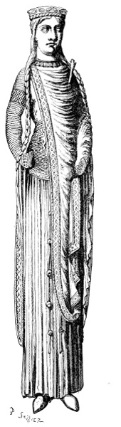 Je ne raconterai pas l'histoire de la coiffure et de la barbe, car on la trouve partout. Elle est bien exposée dans l'Histoire du costume de M. Quicherat, relativement exacte dans les Dictionnaires de la conversation et les Encyclopédies[85]; la refaire d'après les sources serait donc me donner beaucoup de peine en pure perte. D'ailleurs, je tiens à rester fidèle au programme que je me suis tracé; il consiste à exclure autant que possible de ces petites notices les faits déjà étudiés de l'histoire des mœurs, pour me borner à recueillir les détails ignorés ou peu connus, et à relever les erreurs accréditées par une longue tradition. Ainsi, des statues qui ne peuvent être antérieures à 1150 ont fait jusqu'ici attribuer aux mérovingiennes la jolie coiffure que portaient les [Pg 47] grandes dames du douzième siècle; leurs cheveux, partagés au milieu de la tête, descendaient par devant en deux longues tresses nattées et galonnées[86].
