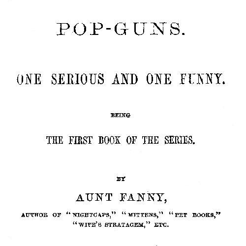 Even now, I cannot resist employing the whimsical mask of an odd title; but my[10] dear friends, try my pop-guns, and if then you are convinced that I have sincerely endeavored to “shoot folly as it flies,” pray believe also, that Aunt Fanny well knows that stories called “Pop-Guns,” will make quicker and more enduring marks in the loving hearts of her darlings, the children, than twenty folios, written by a thousand times greater authors, with the dry title of “Moral Lessons for the Young.”