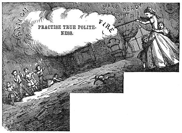 “And now let me tell you the true definition[150] of politeness. It is ‘real kindness kindly expressed.’ Don’t forget this. Put this definition in your pop-guns, and fire it off as often as you can, and, my word for it, everybody you shoot will come to love you dearly. For my part, I should like to dine off such shots, red-hot, every day of my life. And so good night, little Pop-gun youngsters, and pleasant dreams to you all.”