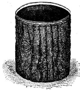 Fig. 1 represents a flower-pot holder made from an empty tomato can. The can is held over a fire until the soldering that fastens the opened or top end of the can melts, when it will be found that by giving the joint a sharp blow with a chisel or a table-knife it will drop off. After a little practice, all danger of unsoldering the side joint of the can is overcome. Strips of bark must now be cut about two inches in width, and the can dipped in hot asphalt. Apply the bark to the outside, filling the joints with moss, lichen, or other products of the woods. You will now have a pretty toy, which will hold a flower-pot; or, if you like, the earth itself may be put directly in the can. In the latter case you must, of course, punch holes in the bottom of your can, as in other flower-pots, so that there may be a circulation of air and water.